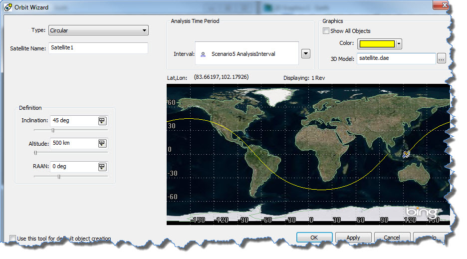 Now you have a model of a meaningful “world”, but your world has no objects. You still need a spacecraft traveling in a Molniya orbit. In STK, the satellite object is used to model the properties and behavior of a vehicle in orbit around a central body.