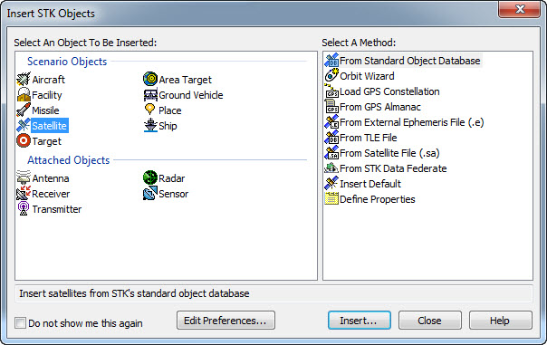When a scenario is created, the Insert STK Objects tool appears automatically unless the Do not show me this again option is enabled. From here, you can begin the object creation and insertion process. The Insert STK Objects tool makes it easy to insert and configure some of the most commonly used individual objects. The left-hand pane lists commonly used STK objects. When you select an object on the left, all of the methods available for introducing that class of object will be listed on the right. The process and data that you will have to provide will depend on the object class and introduction method selected.
