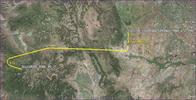 Aircrew mission planners require analytical tools that allow them to determine how atmospheric phenomena and terrain will affect the performance of an airborne mission. Furthermore, they need the ability to model real-world aircraft performance that accounts for variations in airframe performance characteristics and mission requirements. In this lesson, you want to fly a small commuter jet from the City of Colorado Springs Municipal Airport to Telluride Regional airport using Navigational Aids (NAVAIDs) as waypoints. You want to determine how much fuel is required and how much payload can be carried on board the aircraft in a fast, easy way.