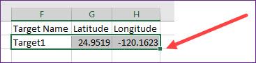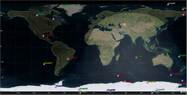 • In the Excel workbook, you created three columns: Target Name, Latitude and Longitude. In the Latitude column, you set a random number formula that entered values between -90 and 90. In the Longitude column, you set a random number formula that entered values between -180 and 180. You created 25 random targets.