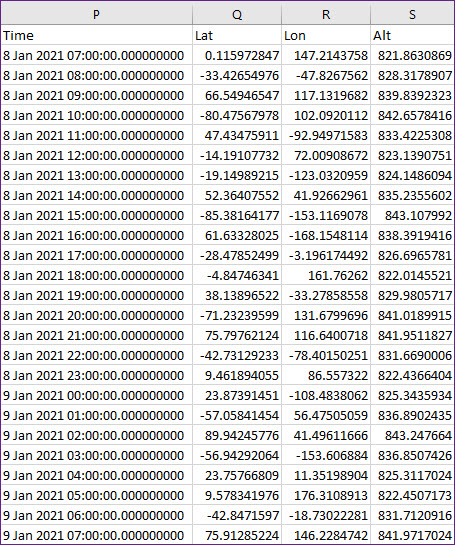 10. You can see the Time, Latitude, Longitude, and Altitude of the satellite in one hour increments over the 24 hour analysis period.