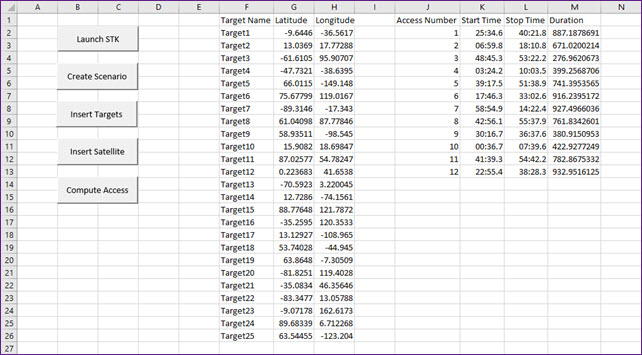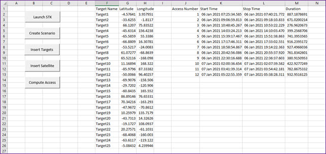 Use Excel to create a new instance of STK and expose the object root. Next, build a new scenario, populating it with a Satellite object and multiple Target objects. Create an access between the Satellite object and a selected Target object. Use the data providers, groups, and elements to retrieve access times from STK into Excel. Download, install and use the STK Excel Add-in plugin. Learn the power of STK Programming Help.