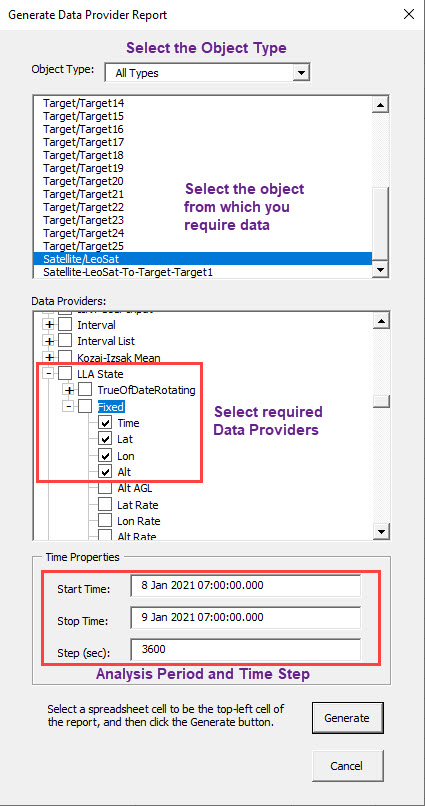 5. Click Extract Data From an STK 12 Data Provider () to open the Generate Data Provider Report tool.