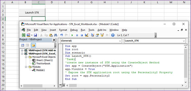• Created the first button and code which launched an instance of STK.