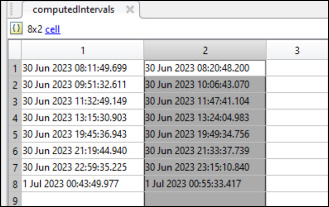 - When the computedIntervals cell opens, expand column 1 and column 2 so you can read the access data; your data will have different values. Column 1 shows the start times of the accesses and column 2 shows the stop times.