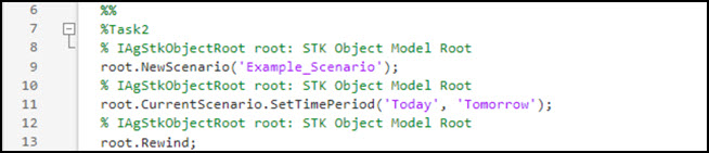 - Go to Using Core Libraries > STK Object Model > MATLAB Code Snippets in the STK Programming Help.
