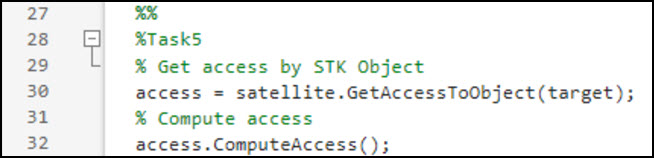 % Get access by STK Object access = satellite.GetAccessToObject(target); % Compute access access.ComputeAccess(); |