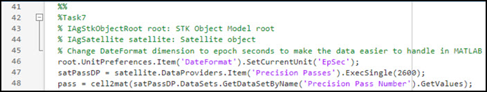 - Look at the code from line 48: pass = cell2mat(satPassDP.DataSets.GetDataSetByName('Precision Pass Number').GetValues);