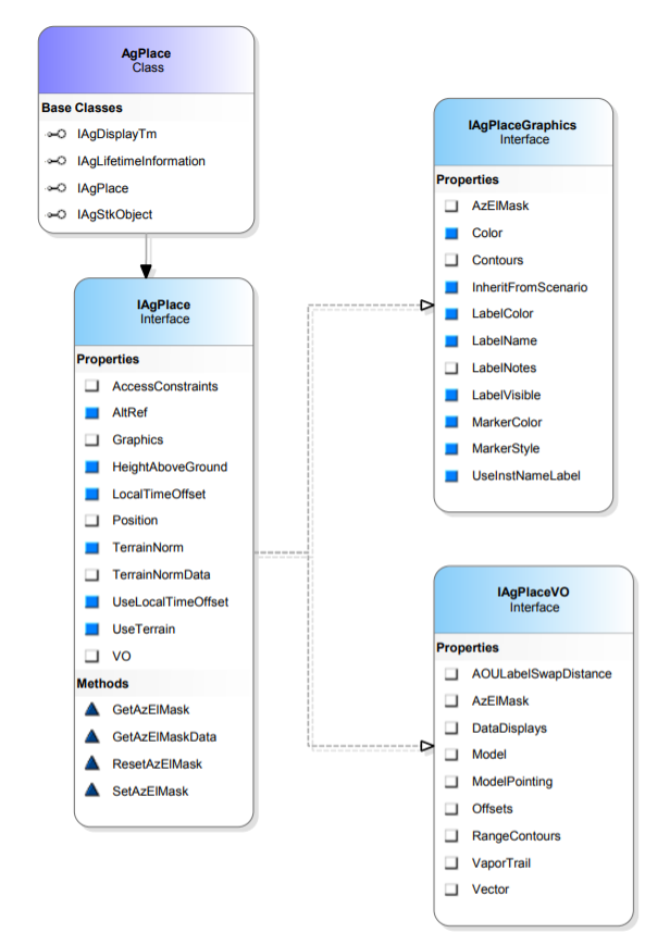 The STK Object Model section listed under Using Core Libraries contains useful code snippets in various programming languages. It also contains information on the various COM libraries that make up the STK Object Model. This information includes useful diagrams that help visualize how the STK Object Model is structured. For example, this small excerpt from the STK Object diagrams outlines a portion of the basic STK Object Model representation of a Place object: