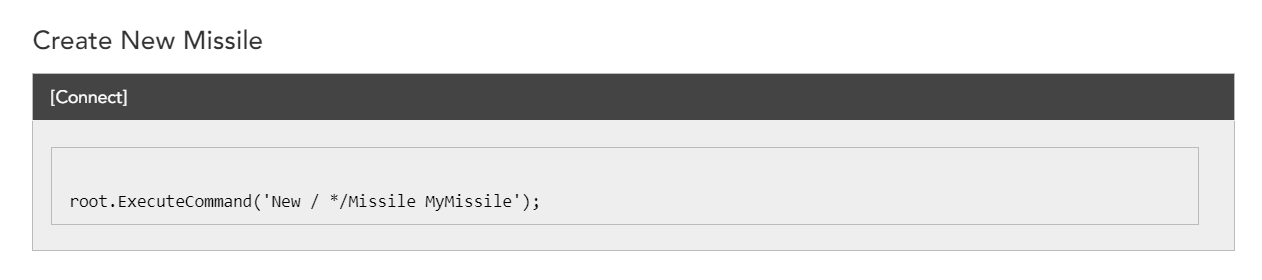 In the Connect section of Using Core Libraries, you will find useful Getting Started information outlining the basics of Connect command and response formats. The section also contains useful code snippets that demonstrate the syntax for various Connect commands. Here is an example of a code snippet showing how to create a new missile object: