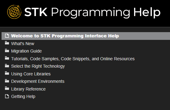 You will find a wealth of information within the STK Programing Interface Help system, including integration tutorials, code snippets, decision trees, and library references.