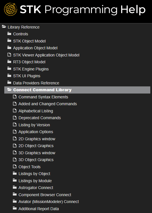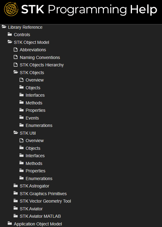 Under Library Reference, you will find documentation on the STK Object Model, Connect Command Library, Data Providers, and more. The STK Object Model documentation is organized by the individual libraries, so there is a section for STK Objects, a section for STK Util, and so on, with each section encapsulating certain aspects of functionality. Within each section items are broken down further by their type. When needed, this can make it quicker to find the exact item you are looking for.