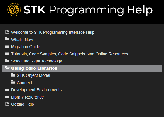 Within the Using Core Libraries directory, you will find additional information on using the STK Object Model and Connect.