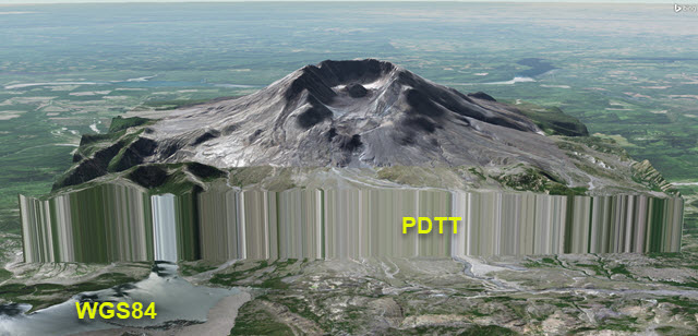 ) object's Basic - Terrain page as analytical terrain. - In the 3D Graphics window, use your mouse to view Mount St. Helens. Note that outside of the St Helens.pdtt the surface is flat, and you are viewing the surface of the WGS84 Ellipsoid.