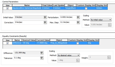 - Select the Delta-V magnitude as Control Parameter and the Difference as the Constraint. Set its value to 140 deg: