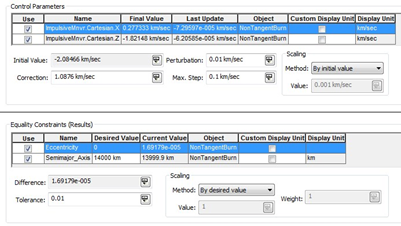 - Semimajor Axis: Desired Value = 14000 km, Tolerance = 0.1 km