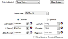 - Set Thrust Vector as Attitude Control and set the X and Z component of the thrust to be independent variables (Z is in the radial direction):