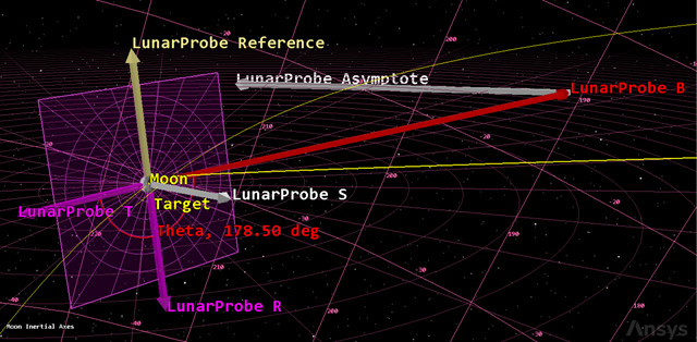Engineers want to model a mission to the Moon. They decide to use the method of B-plane Targeting to utilize the gravity assist to achieve the desired orbit. The B-plane is defined to contain the focus of an idealized two-body trajectory that is assumed to be a hyperbola.