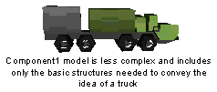 You can use the Component keyword to specify a model with only one level of detail, that is, a model that can only be built using all of the components in the model file. However, this type of model may impact system performance since the same amount of detail is drawn whether the model is 3 miles or 300,000 miles away from the viewer. To alleviate performance issues, models can also be specified using two levels of detail: Component1 and Component0. The Component1 command contains the data needed to draw a less complex model for viewing from a distance while Component0 contains the data needed to draw a fully detailed model for viewing up close. Component1 and Component0 are independent of one another. Both can contain generic Component commands; however, Component1 cannot contain Component0 commands and vice versa.