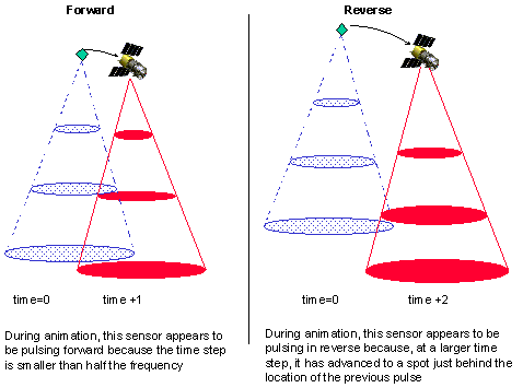 During animation, the display of the sensor pulse in a 3D Graphics window may appear to be traveling in reverse. This is due to the interaction between pulse frequency and the size of the time step. For more information, see Sensor Pulsing and Animation Time Steps.