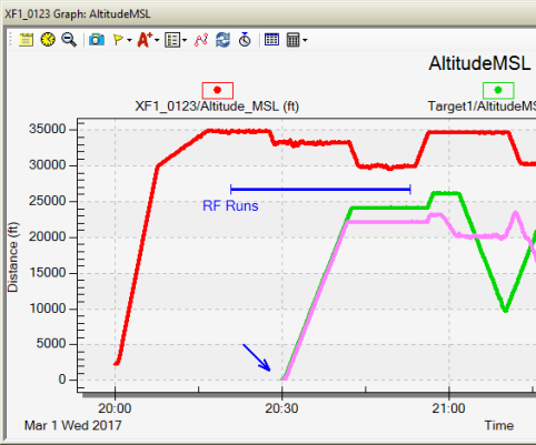 - Zoom To XF1_0123 ownship. Animate the scenario; you will see the vector only during the RF runs.