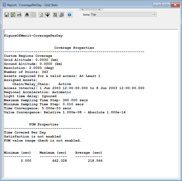 This report indicates that for all the grid points defining the polar cap, at least one point is not seen by the satellite (Minimum = 0), at least one point is seen for ~662 seconds, and on average points are seen for ~219 seconds per day during your analysis period.