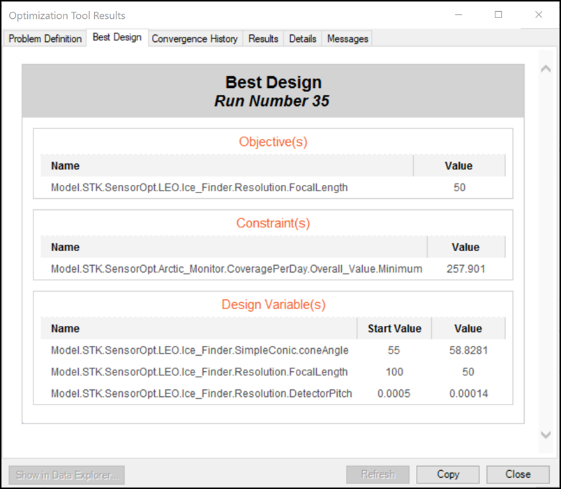 - Select the Best Design tab when the Optimization Tool Results dialog opens.
