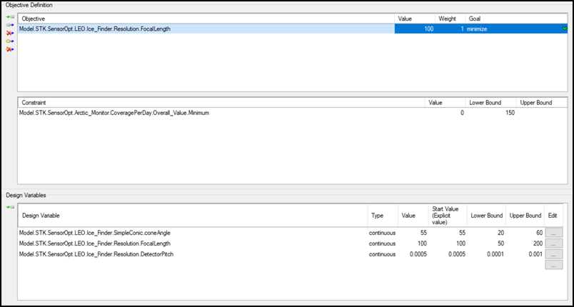 To solve more complex problems, an optimization tool can be a very useful. An optimizer is an automated tool that makes mathematical calculations about a design problem and incrementally attempts to find an optimal solution. You will use the optimizer to minimize the focal length requirement for the sensor while maintaining a minimum coverage capability of 150 seconds per day for your coverage area.