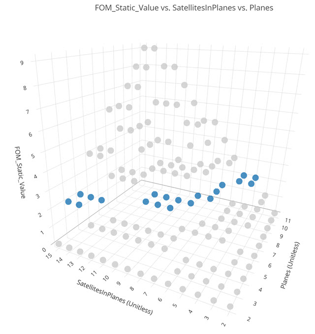 The plot displays the feasible values you are interested in blue. The infeasible results you are not interested in are grayed out. You can determine which combination gives you the fewest number of accesses that provide continuous coverage utilizing the fewest number of satellites.