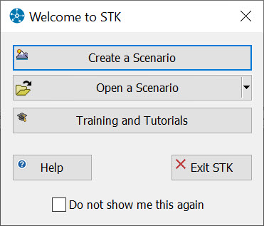 When STK launches, the Welcome dialog will appear. Using the options available here, you can create new scenarios, open existing scenarios, access the STK Help System, or exit the STK application.