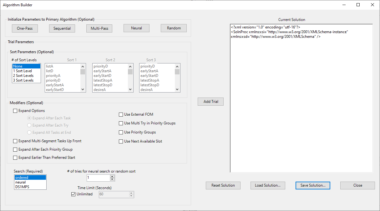 After All options are configured for the custom algorithm, select the "Add Trial" button and then "Save Solution". This will open a Window Save pop up where you can name and place the new custom algorithm. To set STK Scheduler to use the custom algorithm file, Navigate to Schedule -> Schedule Properties Algorithm Tab. Select the Custom radio button, enter/navigate to the Custom Algorithm File, and Select OK. STK Scheduler will now use the custom algorithm when the "GO" button is selected to run the Algorithms.