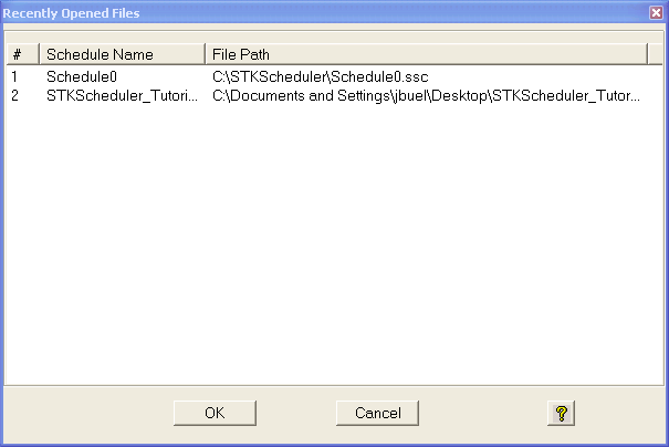 Open a window showing a list of the 10 most recently opened schedule files (see window snapshot below). You may select one of these recent files instead of browsing for a schedule file via the Open function.