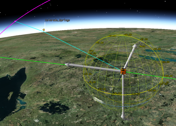 Let's move on to analyze the objects in the constellation. A way to accomplish this is to add an Attitude Sphere. The Attitude Sphere is a visualization aid that can be made to appear in the 3D Graphics and 3D Attitude Graphics windows. When combined with vector display, the attitude sphere can be a powerful tool to display the object's attitude for tracking changes over time.
