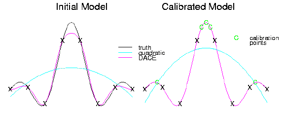 A key feature of the surrogate models used in Design Explorer is their ability to be efficiently recalibrated as new data becomes available [2]. The figure below contrasts least squares quadratic fits and DACE fits before and after calibrating with additional samples.