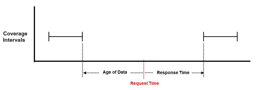 The general relationship between response time and age of data is illustrated below. Given that a request for data comes in at a specific time, the response time is a measure of how long you have to wait until you have a new version of the requested data while age of data is a measure of how long ago a prior version of the data was collected.