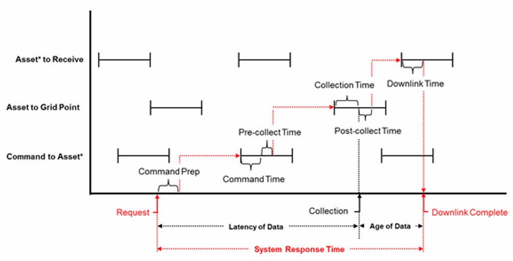 The System Response Time is then computed as: (Time of completion of data downlink – Time of collection request). The dynamic value of System Response Time can be zero only if all delays are set to zero and if simultaneous access exists between a command station, the collection asset and a receive station.