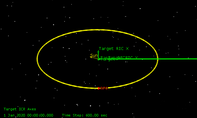 The following picture shows an NMC initiated from -1000 meters on the RBar and then propagated for one revolution.