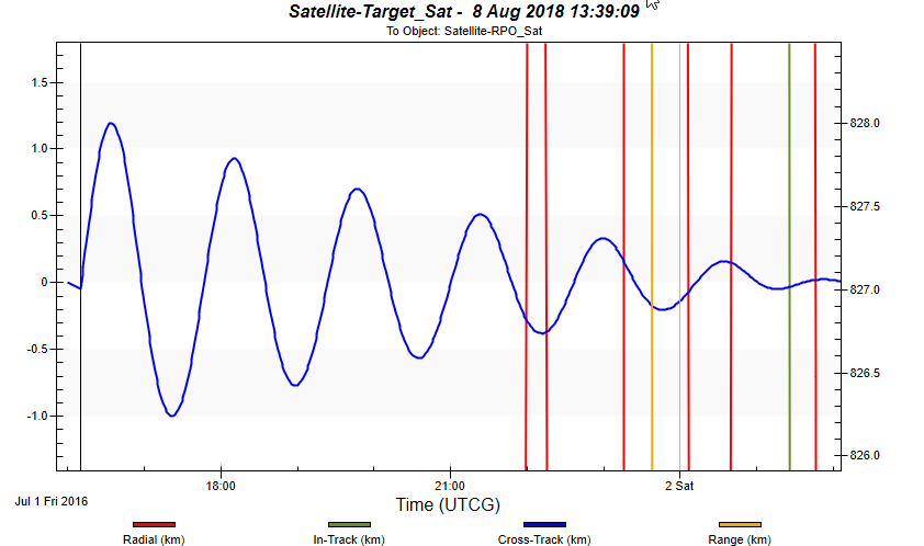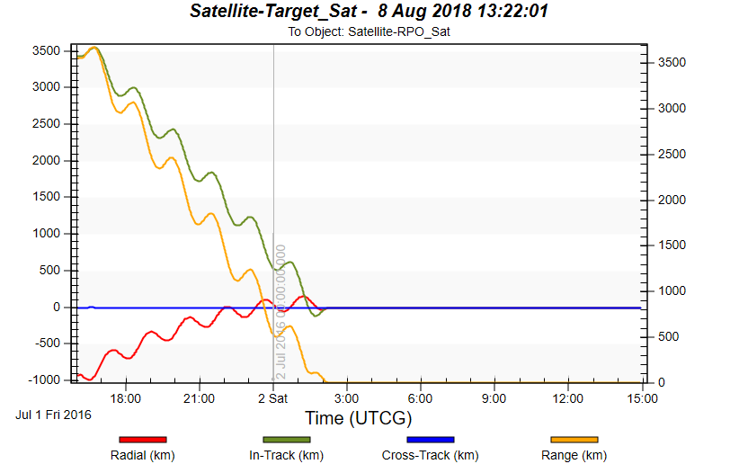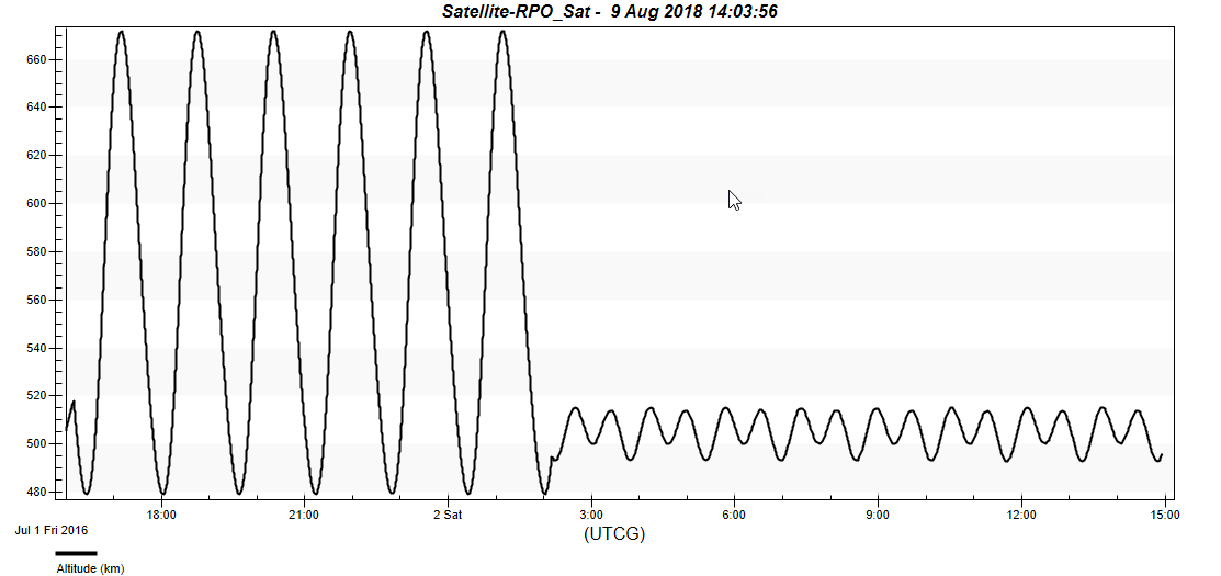 Notice the drastic change in altitude early in RPO_Sat’s ephemeris when it enters the transfer to Target_Sat. Also notice the how there is a jog in the altitude as RPO_Sat enters the NMC around Target_Sat.