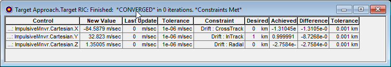 Look at the differential corrector results for the first target sequence (Target Approach).