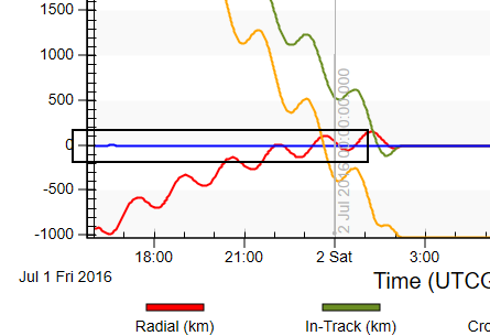 - Keep zooming in in this manner until you can see the initial maneuver (Burn1) affect the cross-track component.