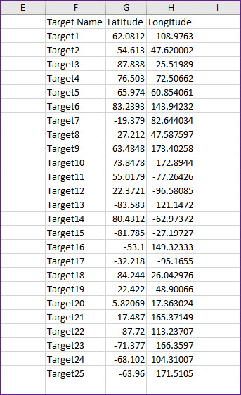 • In the Excel workbook, you created three columns: Target Name, Latitude and Longitude. In the Latitude column, you set a random number formula that entered values between -90 and 90. In the Longitude column, you set a random number formula that entered values between -180 and 180. You created 25 random targets.