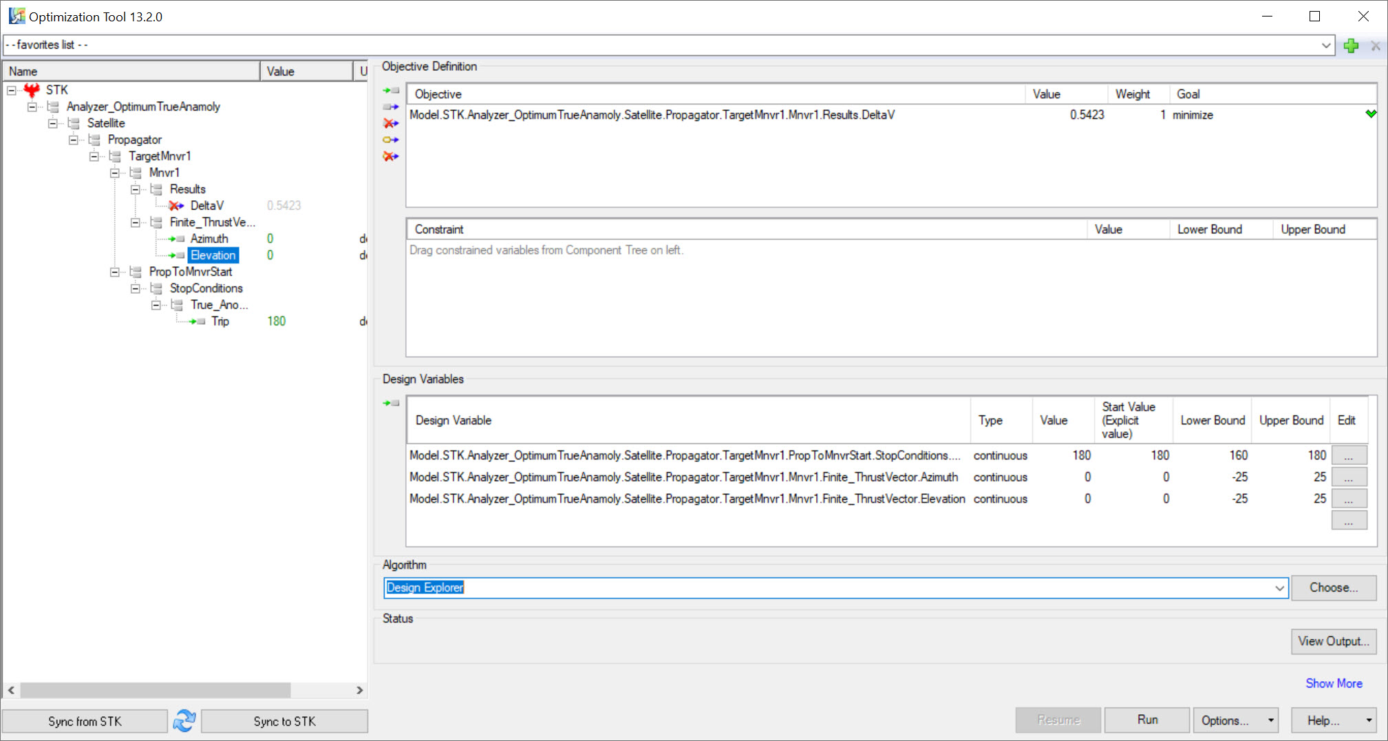Next, change the direction of thrust (azimuth and elevation) to see if this further minimizes the Delta-v required. This study will be performed using Analyzer’s Optimization Tool.