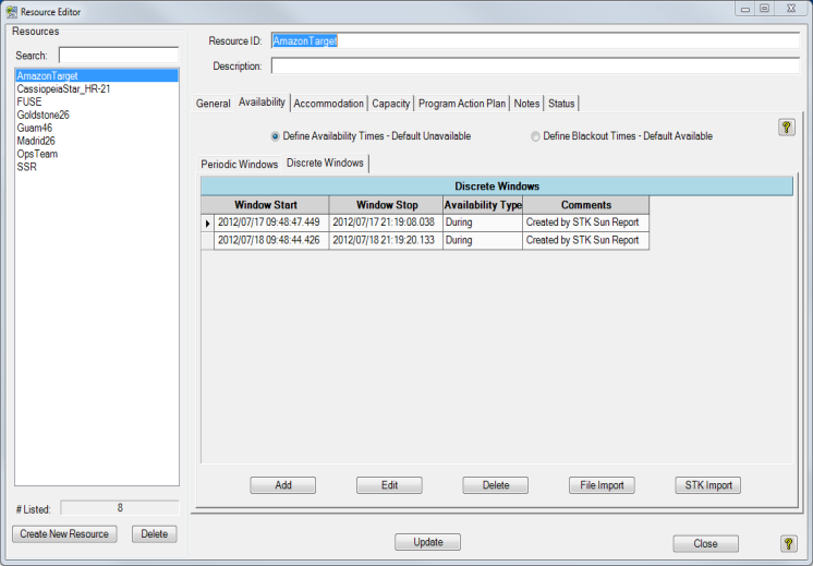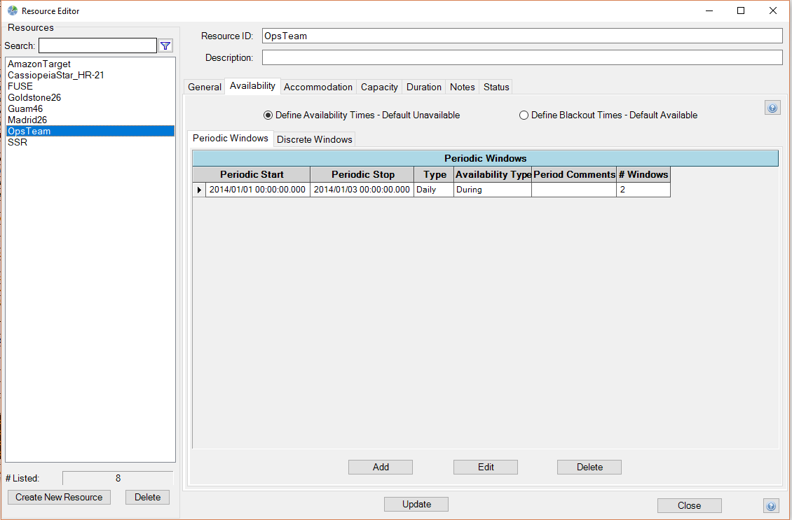 The availability tab provides the controls to determine the time in which a resource is available to be tasked. Availability may be defined as a single window of time or as several windows of time. STK Scheduler defaults a resource's availability as being available for the entire scheduling period. See Availability Definition.