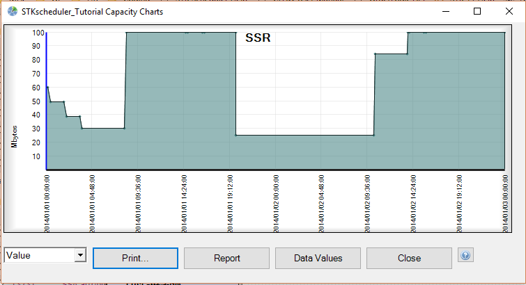 The capacity chart shows the time dependent capacity value of all capacity-applicable resources over the scheduling period.