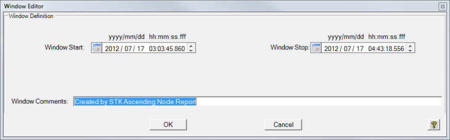 The window comments textbox is a space that allows you to record textual information about that window definition. STK Scheduler retains the text as an attribute of the discrete definition.