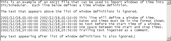 The STK Scheduler File Import feature allows different windows of time to be defined using data from an external text file called a window file.