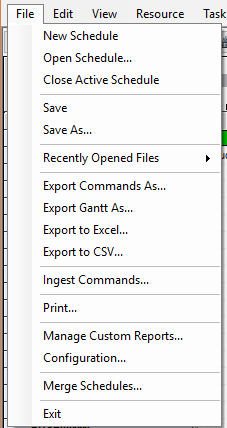 Allows you to export all of the resources, tasks, resource groups and task groups from the current schedule into a command ingest file. When ingested, that command file will recreate the aforementioned schedule, minus assignments.