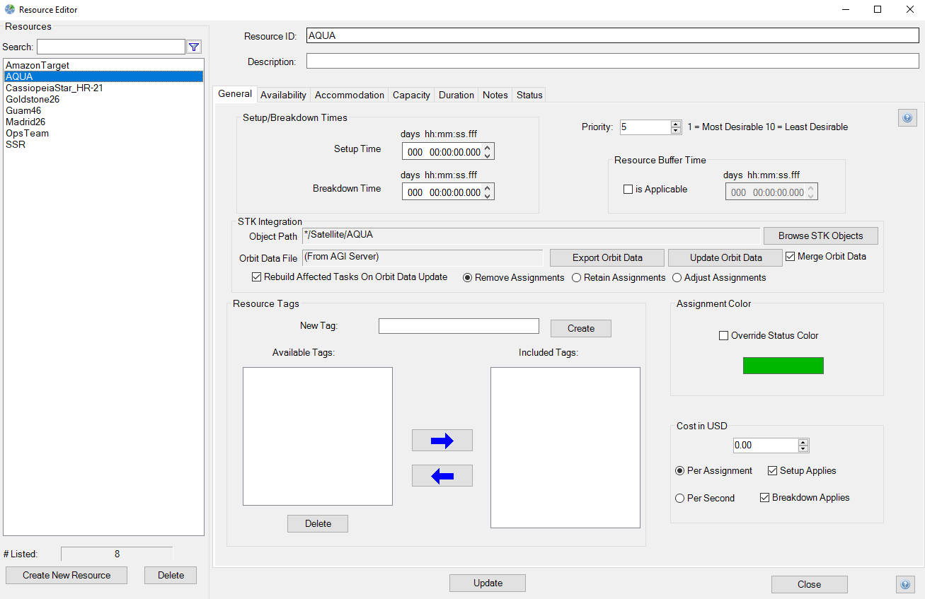 The Resource Tags frame contains the controls necessary to define a new resource tag and assign a resource to an existing resource tag. A resource tag is a concept provided to help you quickly sort through large numbers of resources. STK Scheduler does not require a resource to be associated with a resource tag.