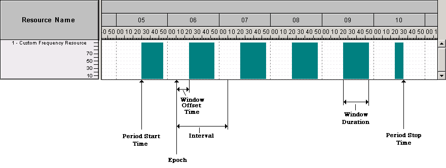 The following graphic shows an example of a custom periodic definition applied to a resource's availability.