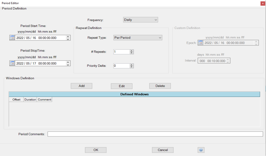 The period comments textbox is a space that allows you to record textual information about that periodic definition. STK Scheduler retains the text as an attribute of the periodic definition.